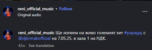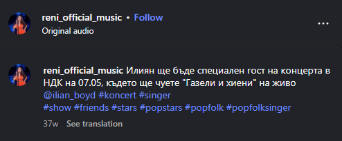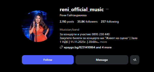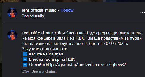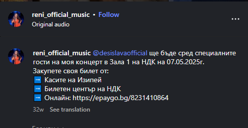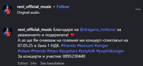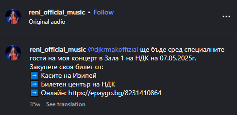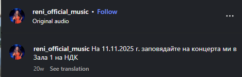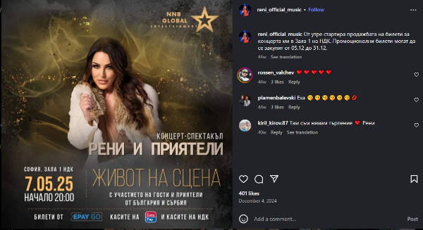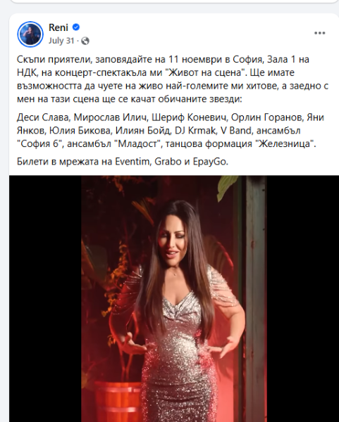 Имаше дигитална маркетингова кампания с платен пост-реклама за концерта, отделно Рени стабилно спами почти цяла година в инста и фейсбуц с концерта, нека не преиначаваме фактите. Нека не пренаписваме историята, както ти е удобно. Във фейсбук Рена има 195 000 последователя, и самият факт, че е промотирала нееднократно там, би трябвало да й доведе поне 3К човека за концерт в най-големият град в страната. Отделно Рена беше в 7/8 ТВ, Колко ми даваш, по НОВА, при Чефо - да представя дуета с Яни и навсякъде се споменаваше и за нейният концерт. 53 хил. гледания · 2,1 хил. реакции | Скъпи приятели, ще ви очаквам... WWW.FACEBOOK.COM Скъпи приятели, ще ви очаквам на 11 ноември в София, Зала 1 на НДК с концерт-спектакъла ми "Живот на сцена". Ще изпълня всички ваши любими песни, а моите приятели ще внесат блясък, който ще се помни....3 точки