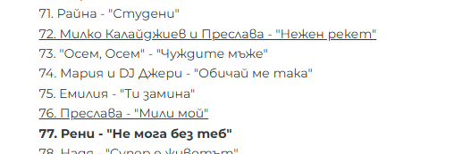 Виждам, че в тази класация Даниела и Преслава са с по 3 самостоятелни песни. Есил Дюран, Вероника и Магда са с по-голям хит за годината от Преслава. А Рени е влязла с балада и дори с песен на почти 2 години. Май не трябваше да я показваш. Но щом си се захванал за 15тото място на Преслава, което отбелязва точно година след старта си, нека спомена, че в годишната класация за ‘99 на Нов Фолк феновете отреждат на Рени 2ро място за най-харесван изпълнител в поп-фолка, между Глория и Румяна е. Пак година след нейния дебют. А година и половина след появата си пък пълни най-голямата зала у нас. 3 години след появата си я пълни отново. Не знам каква ти е идеята, ама дебюта на Рени е доста по-шеметен от този на Преслава. Изобщо, първите 3 песни на Рени са “Искам те”, “Плакала съм” и “Водопад от любов”, а на Преслава са “Нежен рекет”, “Ах, леле, леле” и “Искаш ме”, къде отиваш 😂 Половин година след дебюта на Рени, на нея вече е поверен рецитал от 30мин. (с прием естествено) А за въпросната 2004г., която за Рени е нулева, поради бременност, раждане и възстановяване, нещата седят по следния начин. Преслава изкарва 20 песни за годината, а Рени само 3. Така че сравнението ти дори не буди провокация. Рени изкарва албум с още нови песни на Коледа, така че не се броят за класации за 2004. Преслава може да благодари на Рени, че тя е спомогнала Преслава да види първия си хит, защото нямаше да се добере до този скъп и хитов кавър на Марта Савич. Като цяло дебютната година на Преслава е крещящ случай - кога случаен дебютиращ изпълнител е изкарвал в първата си година 20 песни със 7 клипа? И то не такъв като Гергана, който гръмва за дни. Просто си е бутана бясно Преслава още от самото начало, тя си знае защо. Нищо не виждам да пише за правостоящите, които са се допускали с билети тогава? News about Reni WEB.ARCHIVE.ORG News about Reni WEB.ARCHIVE.ORG2 точки