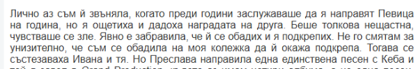 Преслава няма дует с Орлин Горанов, успехи в Сърбия при положение, че всички знаем какви крайни националисти са, стаж като преводач на Пайнера и собственика на Гранд доде договарят кавърите на килограм, рокля на Лепа Брена...2 точки