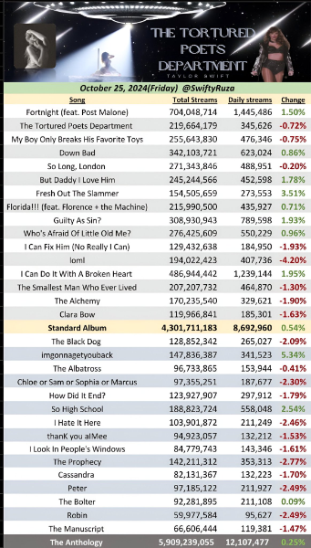 4. Ами като цяло не се е представяла по-добре. Още на първия ден е почнала да пада в apple music докато тази се изкачва или задържа и т.н. Иначе кой казва, че не се харесва ? Ти ли ? Първите дни пирувахте и за уж слабото представяне на DWAS а накрая ще се окаже една отнай-успешните песни за 2024. Гледам, че тенденциозно се опитваш постоянно да омаловажиш Гага и проектите дето издава. Много по-добре е да започнеш с по-слаб дебют и да се задържиш във времето а не да избухнеш с 25 милиона първия ден и няколко месеца след премиерата вече да си аут от топ 100 на спотифай като твоята любимка. @SG, ти какво мислиш за случая с Тейлър ? Аз вече усещам някакво отдръпване от нея. Последния албум върви доста по-слабо в сравнение с предния. Не успя да извади масов хит. Много силни номера първата седмица, но сега албума тъне в забрава. Време беше да се случи това. На повечето хора им писна от Aaron & Jack. Последната част от турнето също не успя да boost-не каталога и за разлика от предните пъти. Има и много по-големи хитове от нейните тази година и освен на VMA където си е абонирана за награди не виждам къде другаде ще изпъкне. Предполагам скоро ще издаде нещо ново.