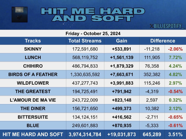 3. 'Stupid love' излиза след една от най-успешните ери и филми на Гага. Тогава интереса към нея е голям. Беше обхванала голям таргет от хора - и малки и големи. ''Шалоу'' е рядко явление и малко хора може да се похвалят с подобен хит в кариерата си. Нормално да има голям интерес към тогавашното ''завръщане'' на Гага. Аз не виждам обективност при теб защото говориш за слабо представяне с данните от първия ден. DWAM е вървяла почти еднакво с този проект и виждаме къде е 2 месеца след премиерата си. Съответно мисля, че обективни мнения спрямо как се развива песента може да се дават след около седмица. Намесвам Тейлър защото е перфектния пример как може да започнеш с някакви брутални начални цифри, недостижими за никой друг, но няколко месеца по-късно албума да ти е забравен и да нямаш масов хит от него. В другата крайност е Били, която не разби никакви рекорди с последния си албум, но изпраска няколко истински хита които се задържаха във времето. И не, вече никой не стриймва албума и. Албум с 31 песни не може да направи и 13 милиона дневно в спотифай. А това, че се купува е факт защото Тейлър пуска по 80 версии и има силна фенска маса, евала за което. Но всички тези силни нейни продажби са един балон надут от феновете и.