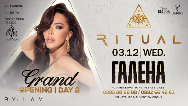 Plazza става RITUA ✦ 03.12 GRAND OPENING | DAY 2 w/ GALENA Live @ RITUAL BY: LAV ✦ Ритуалът е премиум преживяване, което повтаряш, защото ти носи усещане, принадлежност, енергия и те прави част от нещо по-голямо. И точно на това е посветен RITUAL BY: LAV - място, към което се връщаш, защото нощта ти е по-добра тук. Това е клуб за хора, които искат нощното им излизане да има контекст, стил и последователност. Да има… ритуал. RITUAL BY: LAV отваря врати като най-новия high-end нощен клуб в София. На 03.12 (сряда) продължаваме откриването с GALENA Live - втората вечер от нашия Grand Opening week. 📲 Резервации: 0895 88 88 88 / 0882 66 46 62 📍 ул. „Атанас Манчев“ 12A, Студентски град, София -