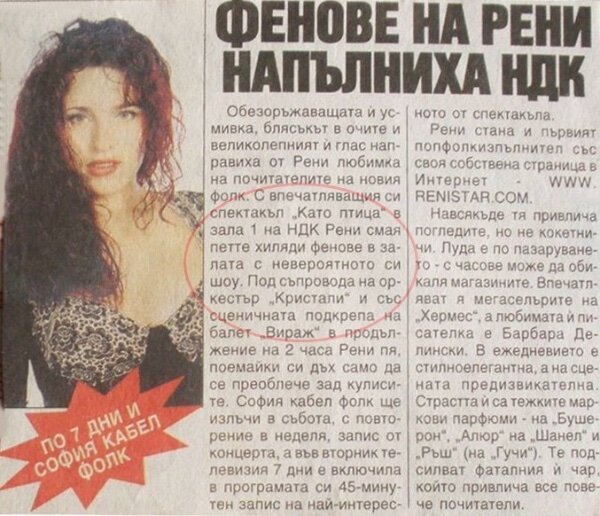Виждам, че в тази класация Даниела и Преслава са с по 3 самостоятелни песни. Есил Дюран, Вероника и Магда са с по-голям хит за годината от Преслава. А Рени е влязла с балада и дори с песен на почти 2 години. Май не трябваше да я показваш. Но щом си се захванал за 15тото място на Преслава, което отбелязва точно година след старта си, нека спомена, че в годишната класация за ‘99 на Нов Фолк феновете отреждат на Рени 2ро място за най-харесван изпълнител в поп-фолка, между Глория и Румяна е. Пак година след нейния дебют. А година и половина след появата си пък пълни най-голямата зала у нас. 3 години след появата си я пълни отново. Не знам каква ти е идеята, ама дебюта на Рени е доста по-шеметен от този на Преслава. Изобщо, първите 3 песни на Рени са “Искам те”, “Плакала съм” и “Водопад от любов”, а на Преслава са “Нежен рекет”, “Ах, леле, леле” и “Искаш ме”, къде отиваш 😂 Половин година след дебюта на Рени, на нея вече е поверен рецитал от 30мин. (с прием естествено) А за въпросната 2004г., която за Рени е нулева, поради бременност, раждане и възстановяване, нещата седят по следния начин. Преслава изкарва 20 песни за годината, а Рени само 3. Така че сравнението ти дори не буди провокация. Рени изкарва албум с още нови песни на Коледа, така че не се броят за класации за 2004. Преслава може да благодари на Рени, че тя е спомогнала Преслава да види първия си хит, защото нямаше да се добере до този скъп и хитов кавър на Марта Савич. Като цяло дебютната година на Преслава е крещящ случай - кога случаен дебютиращ изпълнител е изкарвал в първата си година 20 песни със 7 клипа? И то не такъв като Гергана, който гръмва за дни. Просто си е бутана бясно Преслава още от самото начало, тя си знае защо. Нищо не виждам да пише за правостоящите, които са се допускали с билети тогава? News about Reni WEB.ARCHIVE.ORG News about Reni WEB.ARCHIVE.ORG