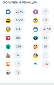 KrasyoZlobarQ Публикувано на Декември 2 Report Сподели Публикувано на Декември 2 Ще ми е интересно да споделите какви реакции предизвиквате с коментарите си. Отидете на профила си вижте колко емотикони са били получени за ваши коментари. https://www.ramania-bg.com/profile/737-meleto/reputation/ Копирайте! 205205 5757 124124 44 1313 1341 1334 88 33 1111 Общо 524. 02/12/2019 Явно аз предизвиквам най-вече сърца и после палец нагоре, а на трето място съм смешен. Я 2 2 Цитирай Report Link to comment https://www.ramania-bg.com/topic/112487-%D0%BA%D0%B0%D0%BA%D0%B2%D0%B8-%D1%80%D0%B5%D0%B0%D0%BA%D1%86%D0%B8%D0%B8-%D0%BF%D1%80%D0%B5%D0%B4%D0%B8%D0%B7%D0%B2%D0%B8%D0%BA%D0%B2%D0%B0%D1%82%D0%B5-%D1%81-%D0%BA%D0%BE%D0%BC%D0%B5%D0%BD%D1%82%D0%B0%D1%80%D0%B8%D1%82%D0%B5-%D1%81%D0%B8/ Сподели в други сайтове More sharing options...