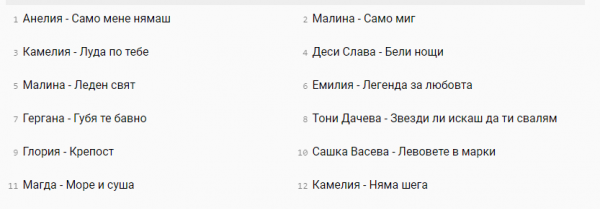 Willy Публикувано Януари 27 Author Report Сподели Публикувано Януари 27 1.? 78т. 2.? 68т. 3.? 68т. 4.? 54т. 5.? 48т. 6. Райна - По-добре 34т. @z_o_ 7. Рени - Като птица съм свободна 34т. @Runevski 8. Руслан Мъйнов - Аз не съм 30т. @.close to me. 9. Тони Дачева и Найден Милков - Грях ли е 26т. @payner_tv Цитирай Report Link to comment https://www.ramania-bg.com/topic/112635-%D1%87%D0%B0%D0%BB%D0%B3%D0%B0%D0%B2%D0%B8%D0%B7%D0%B8%D1%8F-5-1994-2003/page/3/#findComment-2001565 Сподели в други сайтове More sharing options...