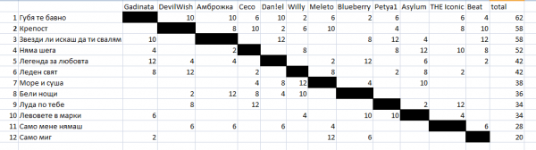 Willy Публикувано Януари 27 Author Report Сподели Публикувано Януари 27 1.? 70т. 2.? 64т. 3.? 62т. 4.? 58т. 5.? 52т. 6. Валдес - Жега 36т. @WindWalkerMonk 7. Нелина - Обичайте/Налей си 36т. @DjBS 8. Азис - Всеки път 34т. @Donatella 9. Райна - Не бях ли 30т. @GSA Цитирай Report Link to comment https://www.ramania-bg.com/topic/112635-%D1%87%D0%B0%D0%BB%D0%B3%D0%B0%D0%B2%D0%B8%D0%B7%D0%B8%D1%8F-5-1994-2003/page/3/#findComment-2001549 Сподели в други сайтове More sharing options...