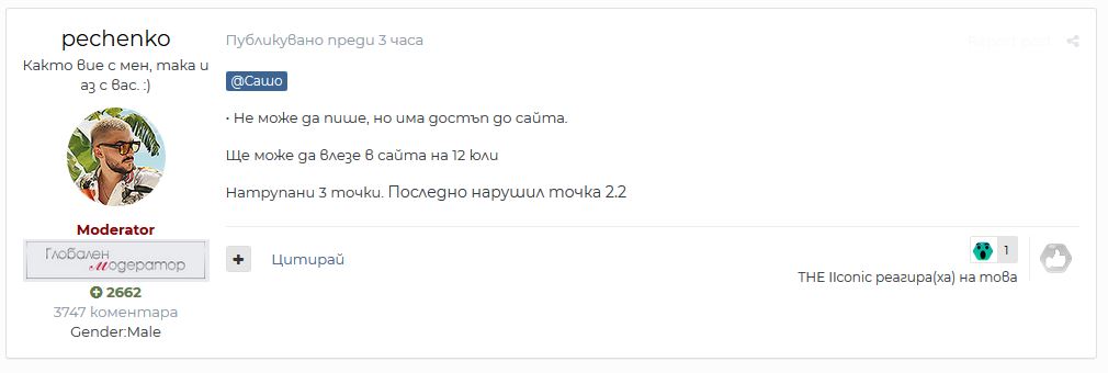 Willy Публикувано Юли 9 Author Report Сподели Публикувано Юли 9 преди 2 минути, VulkoIsTheBest каза: Къде можем да видим постът, заради който е наказан? Скрит е, но цитирам: "Тихо ма, недоклатена тетка! " 2 1 Report Link to comment Сподели в други сайтове More sharing options...
