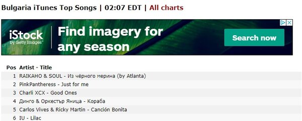 Guest Публикувано Септември 10 Report Сподели Публикувано Септември 10 Брей, Рики с Cancion Bonita е номер 5 в България в Itunes, Изглежда тази песен е много слушана и купувана у нас: 1 Report Link to comment Сподели в други сайтове More sharing options...