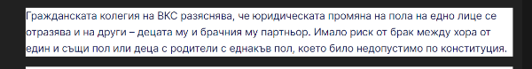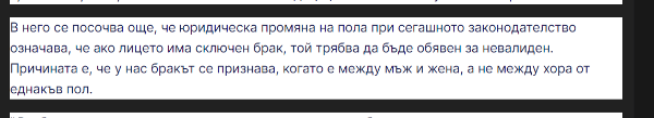 FikLena Публикувано на Февруари 23 Report Сподели Публикувано на Февруари 23 Гражданската колегия на Върховния касационен съд (ВКС) прекрати всички възможности транссексуалните хора да променят по юридически път пола си. Върховните съдии показаха, че са много разделени по този въпрос, като решението бе взето с 28 на 21 гласа. В крайна сметка решението е, че действащото право в България "не предвижда възможност съдът да допусне промяна на данните относно пола, името и единния граждански номер в актовете за гражданско състояние на молител, който твърди, че е транссексуален". Тълкувателното решение може да бъде преодоляно с промяна в закона. Противоречива практика Досега част от българските съдии допускаха, че българското право позволява юридическа смяна на пола, но само изрично след съдебно решение. Затова и се наложи ВКС да приеме тълкувателно решение, което е задължително за всички съдилища. Самият Закон за българските документи за самоличност казва, че при промяна на пола гражданинът е длъжен да подаде заявление за издаване на нови документи в срок до 30 дни. Част от съдиите допускаха възможност за смяна на пола при несъмнени доказателства, че това се налага. Мнозинството от върховните съдии стъпват върху решението на Конституционния съд отпреди две години, в което се казва, че българското право разбира пола като нещо, което се определя с раждането и съществува само в смисъла на биологичен пол. Гражданската колегия на ВКС разяснява, че юридическата промяна на пола на едно лице се отразява и на други – децата му и брачния му партньор. Имало риск от брак между хора от един и същи пол или деца с родители с еднакъв пол, което било недопустимо по конституция. "Подобна промяна следва да се приеме за допустима само при детайлна законодателна уредба, каквато към момента липсва. Ако съдът допусне подобна промяна без детайлна законодателна уредба, това би поставило в състояние на несигурност правното положение на брачния партньор на молителя и на техните деца", се казва в тълкувателното решение. В него се посочва още, че юридическа промяна на пола при сегашното законодателство означава, че ако лицето има сключен брак, той трябва да бъде обявен за невалиден. Причината е, че у нас бракът се признава, когато е между мъж и жена, а не между хора от еднакъв пол. "Разбиранията по отношение на пола, включително разбирането за независимостта му от семейните отношения (брак, родителство и произход), могат да еволюират, но само при установяване на яснота за начина, по който ще бъде осигурена предвидимост при прилагането му като фундамент на правовия ред в държавата. Съотнесено към възможността съдът да допусне преназначаването на пола, давайки си сметка за правните му последици за останалите правни субекти, и за начина, по който това би се възприело в обществото, при липса на обществен консенсус и законодателна уредба, следва да се приеме, че би противоречало на обществения интерес", пишат върховните съдии. Решението на КС През есента на 2021 г. КС се произнесе по въпроса за разбирането за понятието "пол" отново заради същата противоречива съдебна практика. Това решение бе произнесено по искане на ВКС. В него конституционните съдии записаха, че половото самоопределяне може да е основание за промяна на данните в акта за раждане само в особената хипотеза, при която по