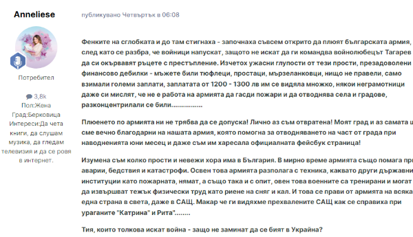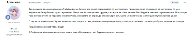 Fast Публикувано Юли 2 Report Сподели Публикувано Юли 2 преди 20 минути, DevilWish каза: Какво е БХК? Може ли линк към тази тема? Български Хелзинкски Комитет, правозащитна организация. Използва го като личностна нападка, защото съм заемал позиции относно човешки права, социална справедливост и тн. преди 19 минути, DevilWish каза: Ама не разбирам какво толкова делите двамата? Честно? От твоя страна не съм видял проблеми, поне откакто пиша повече, може би 2 години? Преди да съм част от модераторския екип може би не съм обръщал внимание на споровете му. Нарочил ме е, защото някога привидно съм се изказал лицемерно, и поради това предполагаемо лицемерие, живее с представата, че може да ме напада по всевъзможни начини и деградира всичките ми позиции, без спирачка в продължение на години. Аз не деля нищо с него. Използва ме като отдушник. Правя отчаяни опити да изляза от тази роля. Много ми е интересно кой ли ще бъде следващия, когато изчезна, защото преди мен имаше един @lucas който нападаше по същия начин покрай темата Камелия или Деса. 1 Report Link to comment https://www.ramania-bg.com/topic/115891-%D1%87%D0%B0%D1%82-%D0%BC%D0%B0%D0%BD%D0%B8%D1%8F-%D1%8E%D0%BB%D0%B8-%D0%B0%D0%B2%D0%B3%D1%83%D1%81%D1%82-%D1%81%D0%B5%D0%BF%D1%82%D0%B5%D0%BC%D0%B2%D1%80%D0%B8-2023/#findComment-2157254 Сподели в други сайтове More sharing options...