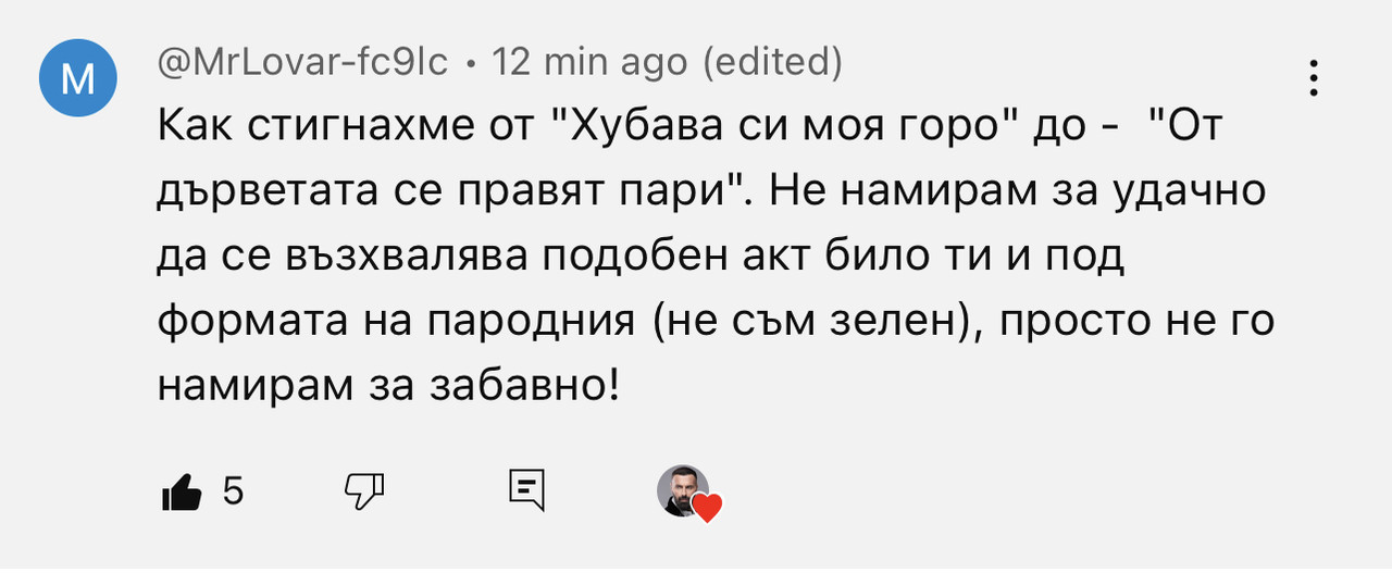 П.С. Песента си е химна на дървената МАФИЯ... Бързо съответните органи да се самосезират... А чакай, то няма такива... Да възпяваш как се правят пари от дърветата... Ей за това после ще ревете що ми се наводниха къщите, ми спете си още...