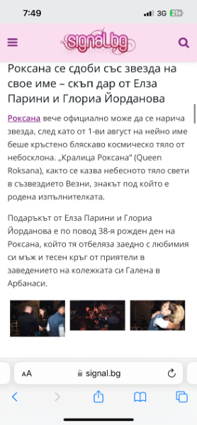 Lelqtian Публикувано Октомври 16 Report Сподели Публикувано Октомври 16 Вече е официално! Кръстиха звезда с името на Роксана за рождения й ден! (снимки и видео) LIFEONLINE.BG Певицата и приятеля й празнуваха рожден ден с Галин и Галена в Арбанаси Тази година звезда във "Везни", догодина - еднопосочен билет дотам! Другаде из същата статия .... Цитат Неч, който е изключително успешен бизнесмен от Германия, пък вече може да се похвали, че притежава парцел на земния спътник Луна. Това са само малка част от подаръците, с които бяха обсипани рождениците. И какво точно му е успешното на бизнесмен, който може да си позволи само малка част и то от земния спътник, а не г-жа кмета на републиката????? 1 Report Link to comment Сподели в други сайтове More sharing options...