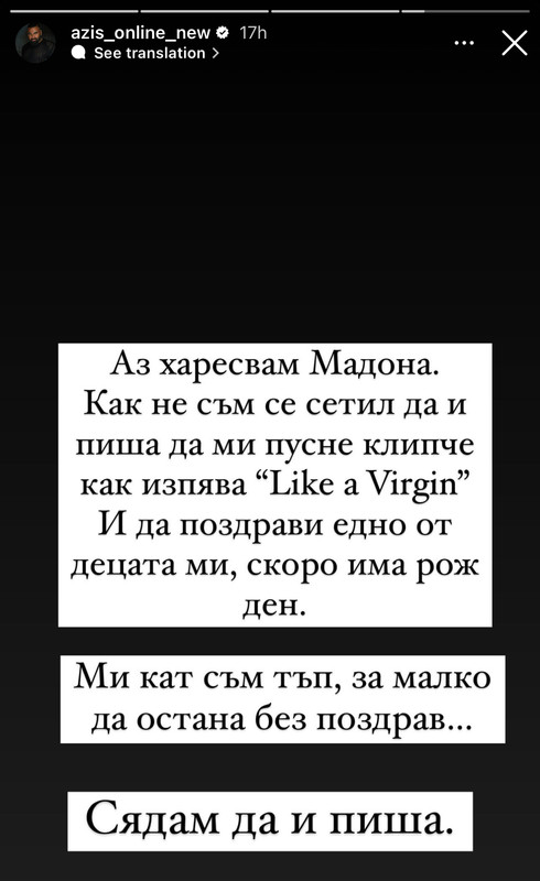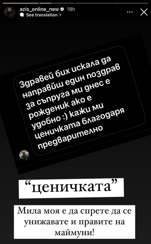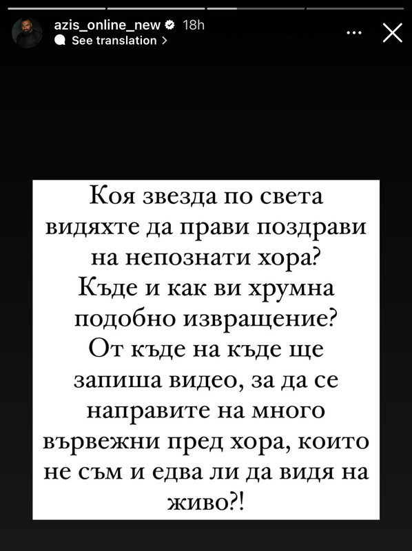adorable Публикувано Октомври 20 Report Сподели Публикувано Октомври 20 Това Азис е рядко неприятна, двулична, хитра и злобна личност с огромно самочувствие. Има някаква неудовлетвореност и пасивна агресия в него, която избива чрез подобни сторита - на мъж на тия години хич не върви. Галин е същата стока. А първият е и много мързелив - нито пее на живо отдавна, нито концерти е направил на фона на това какво име е и се очаква от него, нещо по така с кариерата си, уж в Русия го викаха и щеше да пробива - само се хвали и нищо. 6 Report Link to comment Сподели в други сайтове More sharing options...