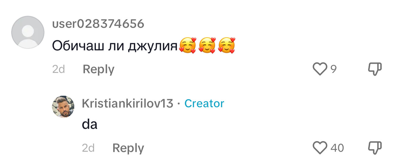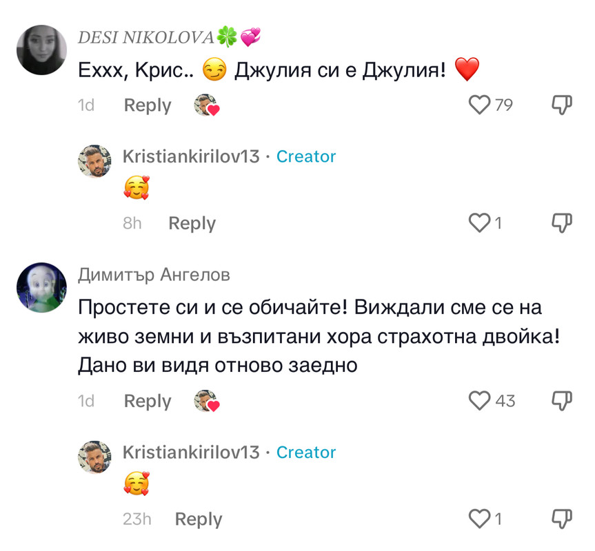 Emanuela.Carey Публикувано Октомври 23 Report Сподели Публикувано Октомври 23 Кристиян Кирилов отново се моли публично в Тикток Джулия да го прибере обратно. 4 Report Link to comment Сподели в други сайтове More sharing options...