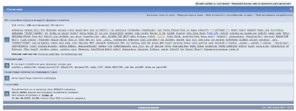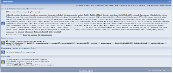 Andrew Cunanan. Публикувано Април 21 Report Сподели Публикувано Април 21 преди 1 минута, meleto каза: Разгледах до 2005-6 и наистина снапшотовете са с по 5 потребители. Не знам как и защо са такива. Освен да е имало някакво ограничение на достъпа. Но както виждаш от 2007ма, наистина са така както помня. По 250-1000 души (повечето снапшотове са правени през нощта или обед-следобед). И помня, че много се триеха постове и теми и въпреки това е имало почти 1 милион коментара. което показва каква институция бяха тогава и колко трагични са сега. 3 Report Link to comment Сподели в други сайтове More sharing options...