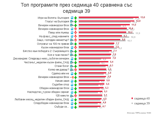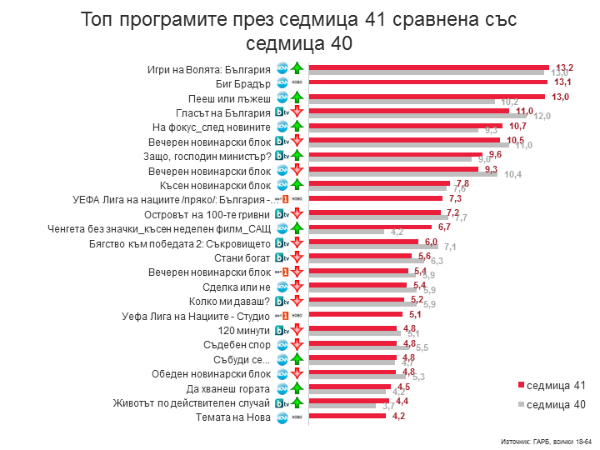 KrasyoZlobarQ Публикувано Октомври 21 Author Report Сподели Публикувано Октомври 21 Биг Брадър е практическият номер едно. Въпреки долните номера с късното започване е буквално изравнен с ИВ. Да не говорим, че е извън основния праймтайм. Участието на Галена в Пееш или лъжеш е било много рейтингово. Реално и трите продукции на НОВА са с близки резултати. Гласът на БГ е единственото успешно предаване на БТВ. Островът продължава да потъва, а предаването на Керана изпада от ТОП-а хахахах заради Биг Брадър, вероятно. 2 Цитирай Report Link to comment Сподели в други сайтове More sharing options...