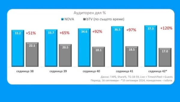 KrasyoZlobarQ Публикувано Октомври 17 Author Report Сподели Публикувано Октомври 17 преди 5 часа , Emanuela.Carey каза: БТВ само Фермата ги спасяваше последните години. Иначе от доста време са абсолютен провал в сравнение с Нова. Дано са измислили нещо за пролетта, иначе Хелс Китчън ще ги доминира. Може да се спасят ако в следващия сезон на Dancing with the Stars намерят интересен каст. Това май им се оказа провал. Едва ли ще го повторят. Ще е яко да направят Ергенът в двете версии + Момата наведнъж и да излъчват по час и половина всяко. Сигурен съм, че това ще е по-интересно за зрителите. В седмицата преди ББ да почне... Реално ИВ не е чак толкова по-предпочитан от Гласът. Интересното е, че при участието на Тони Димитрова рейтингът на Пееш или лъжеш се е свалил. А бяха на първо място предната седмица. Стоте гривни е пълен провал - двойно по-нисък рейтинг от ИВ. БУквално предаването на Седем Хосми е с почти същия рейтинг хахх Цитирай Report Link to comment Сподели в други сайтове More sharing options...