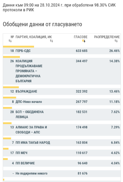 Слаба избирателна активност. Няма да коментирам фигури (пуснах ги в груповия чат). Засега Гербавите водят с голяма преднина, ПП-ДБ са втори, Възраждане трети, а Догановото ДПС има малко по-голям процент от на Пеевски. ИТН влизат, Величие и Меч не.