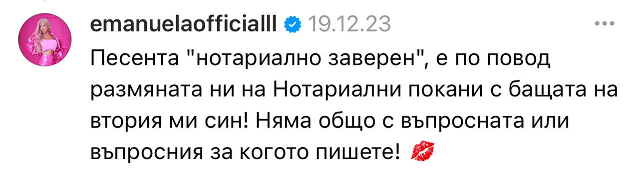 borisslav1 Публикувано Януари 24 Report Сподели Публикувано Януари 24 преди 3 минути, Emanuela.Carey каза: Нотариално Заверен е за Динев За Елвиса мисля че бяха “Дърпай я” “Подводница” и “Направо в Коша” (не случайно в клипа го хваща с друг мъж 😶) Нека Емилия Цветкова а.к.а. Емануела прости грешката ми! Това не беше ли пак за някоя нейна изгора? 1 Report Link to comment Сподели в други сайтове More sharing options...