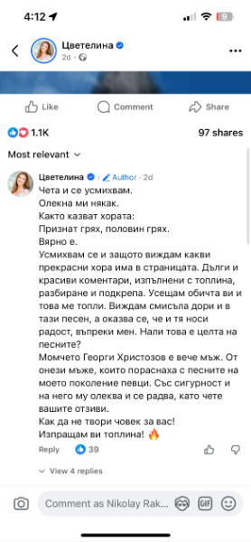 Willy Публикувано Петък в 17:06 Report Сподели Публикувано Петък в 17:06 преди 3 минути, Emanuela.Carey каза: Бях забравил за тази песен. Май и Галена не заложи на нея и я остави в архива. Има си своята аудитория, 12М в Yt и 1.3М в Spotify. Явно тогава остана в сянката на Не си ме давай. 2 Цитирай Report Link to comment Сподели в други сайтове More sharing options...